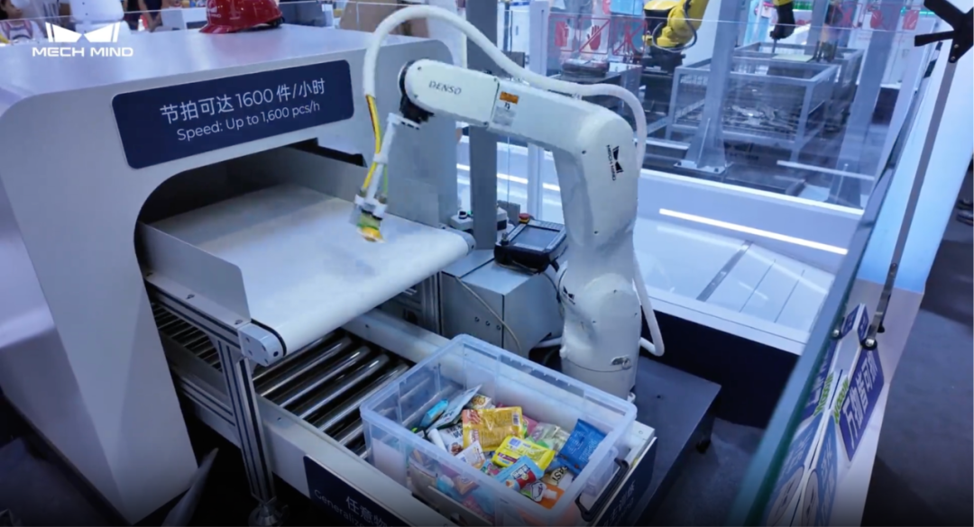 该单元展示了通用机器人“眼+脑”与工业机器人的融合应用。基于具身智能“眼+脑”,机器人通过自主训练即可快速分拣海量种类物体。抓取节拍可达1600件/小时,已广泛用于工业、物流、电商、零售等领域。