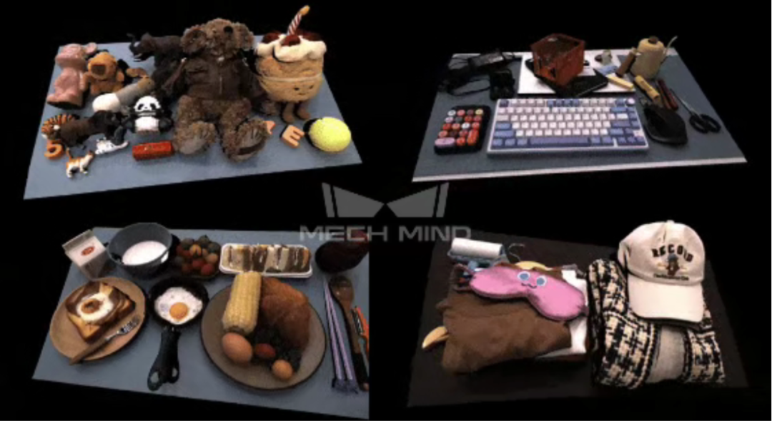 △ 以上物体点云由Mech-Eye高精度3D相机采集,依次为各种真实玩具、办公用品、餐具&食物、衣物。