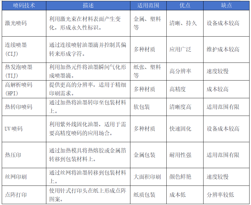 喷码技术是指在产品表面喷印特定信息的过程,这些信息包括但不限于生产日期、有效期、批号等。常用的喷码技术有以下几种类型: